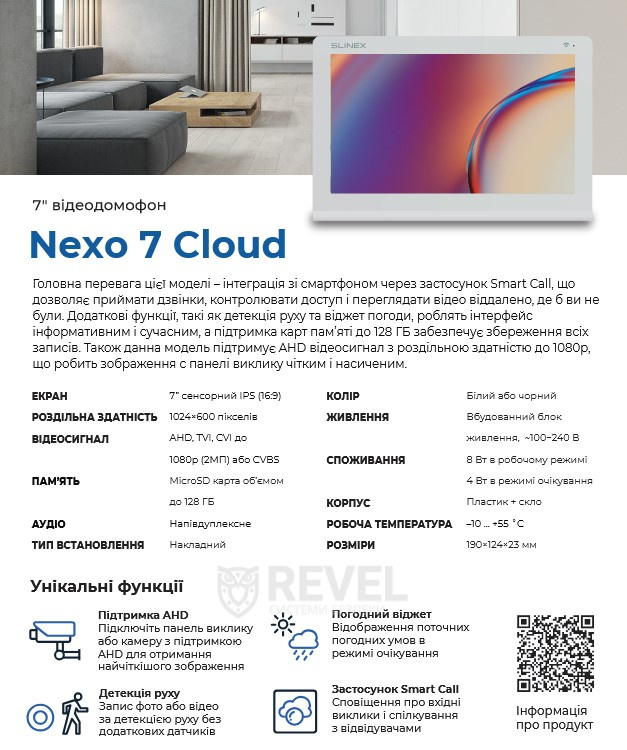 Основна перевага Nexo 7 Cloud – повноцінна робота з платформою Smart Call: приймайте виклики з панелі виклику на смартфоні, відкривайте двері на відстані, переглядайте відео в реальному часі та отримуйте повідомлення про події. Додаткові можливості – програмна детекція руху, вбудований віджет погоди та запис на карту microSD до 128 ГБ – роблять пристрій максимально функціональним для сучасного дому чи офісу.
