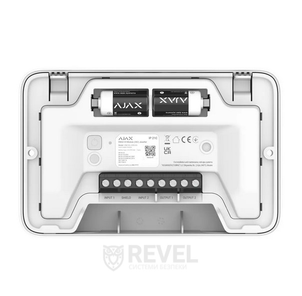 EN54 I/O Module (2X2) Jeweller — це бездротовий модуль із двома входами та двома релейними виходами, призначений для інтеграції сторонніх дротових пристроїв у систему Ajax. Відповідає стандартам EN 54. Входи підтримують підключення пожежних датчиків (диму, температури, чадного газу), кнопок тривоги чи інших пристроїв із типами підключення NO, NC, EOL, 2EOL, 3EOL. Виходи керують автоматичними воротами, замками, аварійним освітленням тощо.