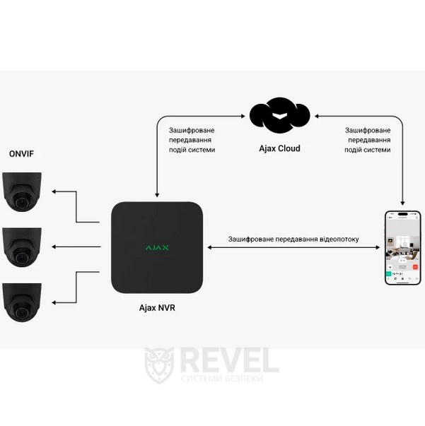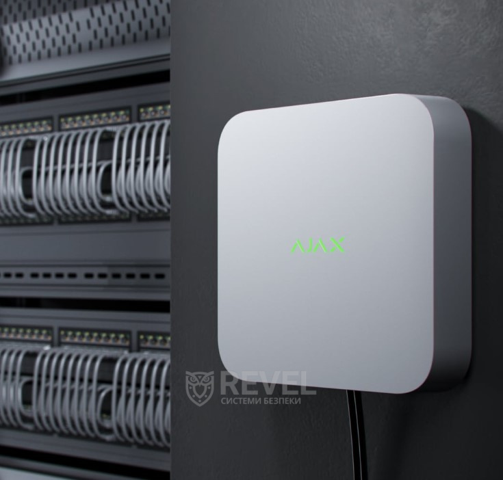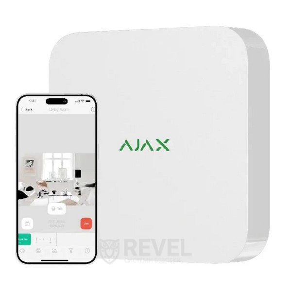 Ajax NVR — 8-канальний мережевий відеореєстратор, підтримує IP-камери сторонніх виробників, які працюють за протоколами ONVIF та RTSP. За допомогою програм Ajax користувач може переглядати записані відео як в реальному часі, так і в архіві.