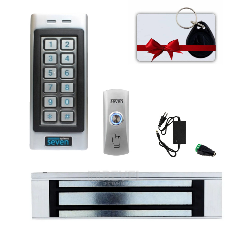 Комплект системи контролю та управління доступом з електромагнітним замком SEVEN SKD-KIT-EMG7 підходить для встановлення в під'їзд, склад, СТО, офіс, магазин, на прохідну підприємства та в інших приміщеннях, з важкими металевими дверима. Двері відчиняються із зовнішнього боку при піднесенні брелока (або карти) до зчитувача або набору коду на клавіатурі, а з внутрішньої сторони — за натисканням на кнопку вихід.