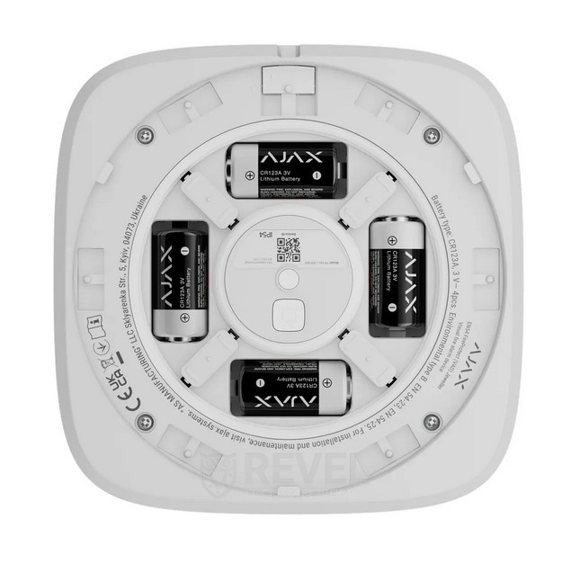 Монтаж виконується професіоналами на стелі (до 3 м) або стіні (до 2,4 м) з урахуванням видимості світлодіодної рамки. Кріпильна панель SmartBracket дозволяє поворот на 90° і фіксацію гвинтами або тимчасово скотчем. Уникайте місць із низьким сигналом Jeweller, біля металевих предметів чи на відстані менше 1 м від ППКП. Підключення до системи здійснюється через QR-код у застосунку Ajax, де задаються параметри пристрою. Батареї забезпечують тривалу автономну роботу, із сповіщенням про розрядження.
