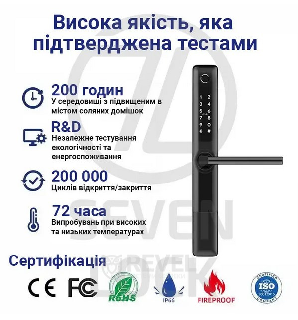 Крім того, пристрій витримує понад 200 000 циклів відкриття та закриття, що підтверджує його довговічність та надійність навіть у складних умовах експлуатації. Смарт-замки SEVEN LOCK відповідають класу захисту IP55, що означає герметичність від пилу та надійний захист від водяних струменів. Такий рівень захисту дозволяє встановлювати замок не лише всередині приміщень, а й на вуличні двері. Навіть у дощову погоду пристрій зберігає працездатність та гарантує безперебійну роботу у складних умовах довкілля.